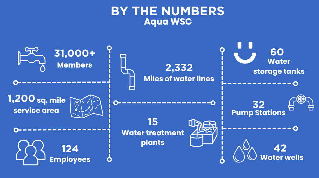 Aqua Water Supply Corporation (WSC) is a 501(c)(12) non-profit corporation located in Bastrop, Texas, providing water service for homes, farms, businesses and ranches. Aqua WSC serves rural and urban residents and businesses in an approximately 1,200-square mile service area in seven Texas counties, including most of Bastrop County and parts of Travis, Lee, Caldwell, Fayette, Gonzales, and Williamson Counties. With 30,000 meter connections (and growing), more than 100,000 residents rely on Aqua WSC as a safe, reliable, and sustainable source of drinking water. In terms of meter connections, Aqua WSC is the second largest Water Supply Corporation in Texas.